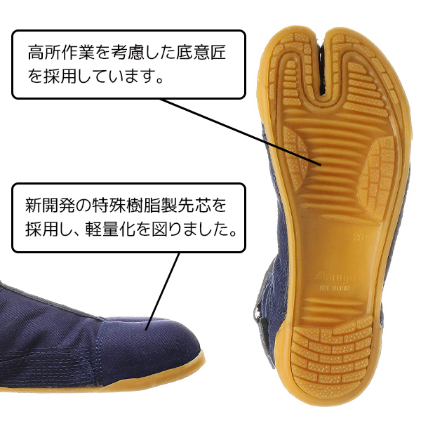| 商品説明 | ●サイズは7サイズ(24.5cm、25.0cm、25.5cm、26.0cm、26.5cm、27.0cm、28.0cm)よりお選びください ●用途:土木、建築作業 ●土木、建築作業用地下足袋です ●素足感覚で踏ん張りもきくので、高所作業に最適です ●ファスナータイプで脱ぎ履きも楽です ●先芯入りでつま先をガードします ●特殊樹脂製先芯で衝撃や圧迫からつま先を保護 ●底を縫い付けているので剥がれにくい ●ゴム底で滑り軽減 ●かかとへの衝撃を吸収するスポンジによりかかとや膝への負担を軽減します ●アッパー素材に綿を使用し通気性が良く水分の吸湿や発散性に優れる |