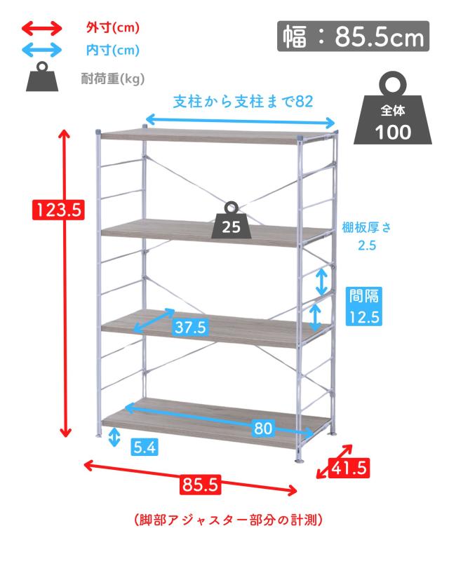 | 商品説明 | ●プラスドライバーをご用意ください。 ※重量もあるため、お二人以上での組み立てをおすすめいたします。 ※簡単設置構造のため、横揺れします。耐荷重には影響ございませんが、ご利用時に気になる場合は、『コの字補強バー』もご利用ください。 ※本体外寸の「幅」は、足元のアジャスターの外側〜外側の寸法になります。 ※2024年1月15日より、クロスバー2点仕様に順次改定して参ります。従来品とはクロスバーの長さが異なります。 ※2022年2月2日より、新色Aホワイトが追加されました。 ●モノに合わせて棚の位置を変えられる木製棚板のスチールラック ●インボックスなど収納ボックスが縦にすっぽり収まるサイズ設計 ●棚板は木の質感があってお手入れもかんたんな、合成樹脂化粧繊維板 ●軽くて強いフラッシュ構造で、1段あたり25kgの耐荷重 ●フックでフレームに引っ掛けるだけなので、位置の変更もかんたん ●棚板を追加したり複数揃えると、フラットに横連結可能 ●脚部には、ガタつきを抑えるアジャスター付き ●耐荷重: 1段あたり25kg、全体100kg ●可動式棚板4枚(板の厚さ2.5cm、約12.5cm間隔、10段階高さ調節) ●(最下段時)棚板下5.4cm ●棚板サイズ: 幅80 奥行き37.5cm ▼別売りパーツの取り扱いを2022年1月より開始しました ・キャスターセット(ストッパー付き2個、ストッパーなし2個) ・追加棚板 ・コの字補強バー ・帆立(側フレーム、片側ずつ) ・クロスバー ●専用キャスター装着時耐荷重: 1段あたり25kg 全体100kg ●専用キャスター装着時: 本体高さ128cm ▼2025年1月より以下のパーツが追加となります。 ・2段引き出し ・スライド棚 ・ストッカー+コの字バー |