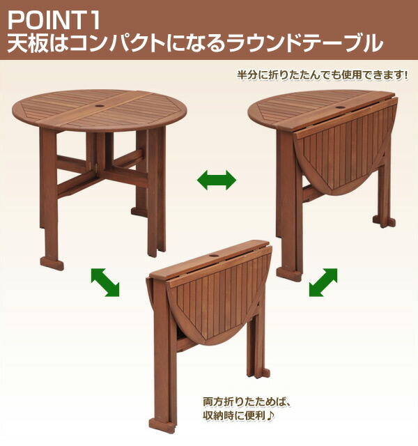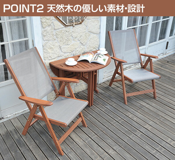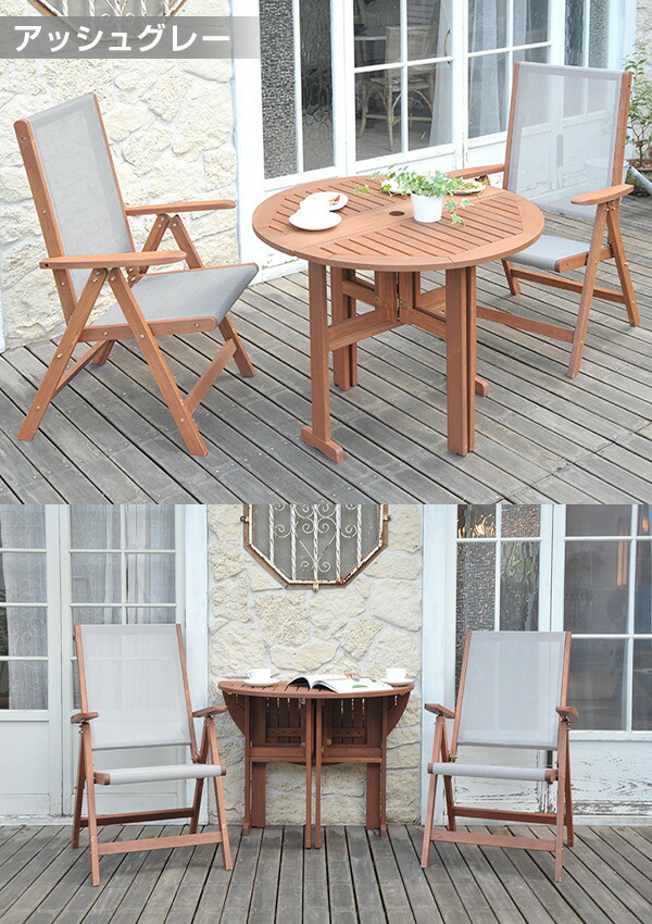 | 商品説明 | ●天然木マランティ材を基調に仕上げたテーブル&チェア3点セット ●天板はコンパクトになるラウンドテーブルタイプ ●半分に折りたためば壁付けしてご使用いただけます ●雨に強い天然木マランティ材を採用 ●チェアの座部は通気性の良いメッシュ生地を採用 座り心地、手触りが抜群です ●チェア背部は7段階にリクライニング可能 ●パラソルホール:直径5cm ●テーブル、チェアどちらも折りたたみ可能 ●テーブル折りたたみサイズ:幅90 奥行14 高さ73.5cm ●チェア折りたたみサイズ:幅62 奥行14 高さ90cm ●テーブル脚元有効サイズ:直径40×高さ23cm ※2019年10月31日より「ブルー」色は廃盤となりました ※2024年5月1日より「アッシュグレー」色が追加となりました |