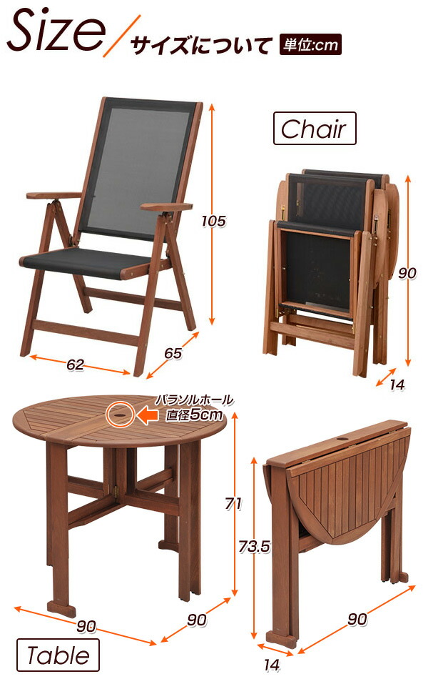 | 本体サイズ | テーブル:幅90×奥行90×高さ71cm 重量13kg チェア:幅62×奥行65×高さ105cm 重量9.5kg |