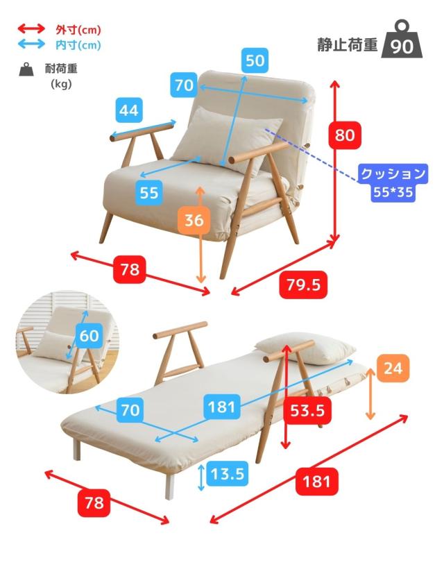 | 本体サイズ | 【ソファ時】幅78×奥行80×高さ79.5 (座面高さ36)cm 重量19kg 【ベッド時】幅78×奥行181×高さ53.5 (床面高さ24)cm |