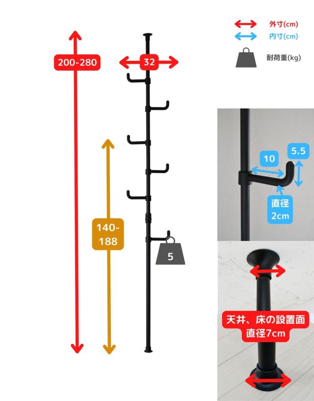 | 本体サイズ | 直径32cm×高さ200-280、140-188cm 重量2kg ※天井高さ188-200cmの間は設置できません。 |