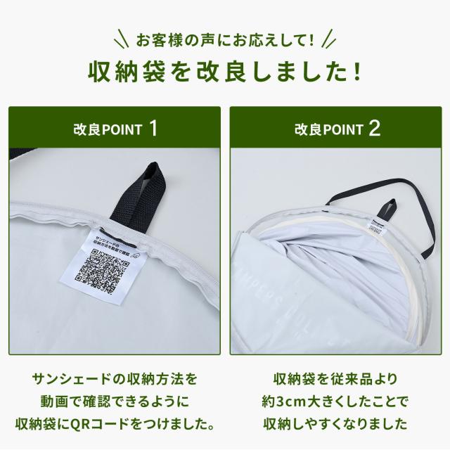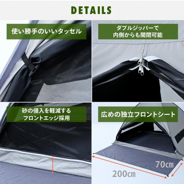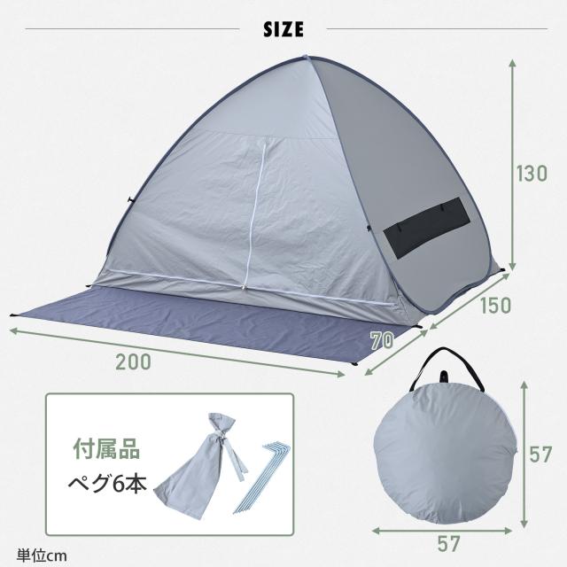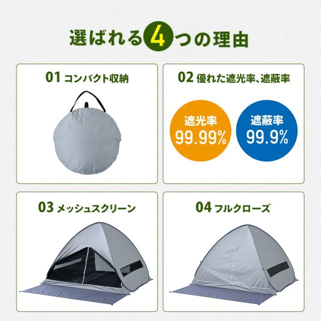 | 商品説明 | ●遮光率99.99%以上、遮蔽率99.9%以上の生地を採用 ●フルクローズできるので、気になる視線をシャットアウト ●簡単設置のワンタッチ式 ●砂の浸入を軽減するフロントエッズを採用 ●収納サイズ:直径57×高さ5cm ※この商品は2026年1月15日より一部仕様を変更しております 【変更点】 ・背面メッシュがさらに大きくなり、通気性が向上しました ・エクルベージュ、サンド色追加 |