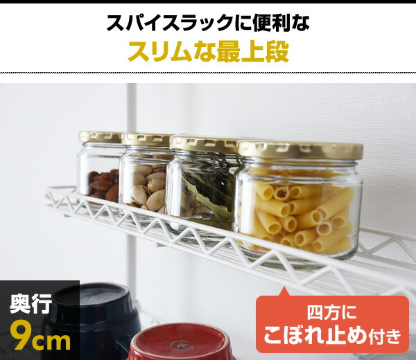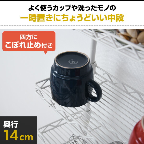 | 商品説明 | ●設置場所が柔軟な、突っ張り固定式キッチンラック ●棚板を調節できる、スチールラックタイプの棚板4段式 ●最下段は、使わない時はたたんでスペースを広く使える跳ね上げ式 ●棚は全段、こぼれ止め仕様(約1.5cm) ●棚板は「カチオン電着塗装」の下処理がされ、水に強い加工 ●左右付け替え可能なふきんハンガー、高さも調節可能 ●耐荷重:棚(小) 2kg、棚(中) 3kg、棚(大)4kg、ふきんハンガー(1本)100g、全体10kg ●棚(小):29×9cm ●棚(中・2段):29×14cm ●棚(大):26.5×17.5cm ●3連ふきんハンガー:約19cm ●2017年2月1日より、リニューアルモデルでの販売となります。 棚板が1段追加、棚にこぼれ止めが追加、塗装が粉体塗装 |