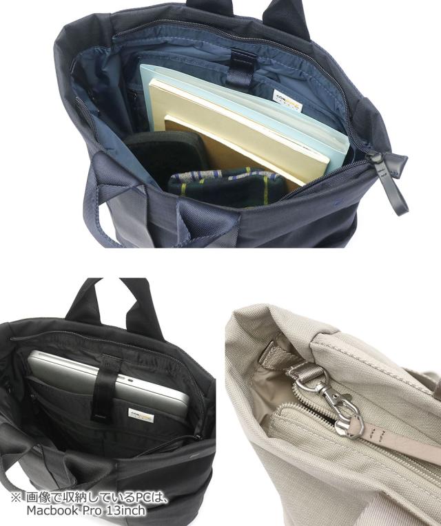 メインルームはA4サイズ対応で、デイリーユースとしても使いやすいサイズ感です。内装には細かいアイテムをすっきりまとめられるポケットや、13インチまでのPCが収納可能なクッションポケット付き。また開口部には引手をフックで留められる簡易ロックが備えられ、安心感のある作りとなっています。