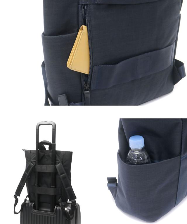 本体の背面側にはスーツケースとのセットアップが可能なベルトを備えており、荷物が多くなる旅行時でもスムーズな移動が可能。またペットボトルなどのすぐに取り出したい荷物は両サイド、スマホなどの使用頻度の高い物はジップポケットが便利なスペースです。