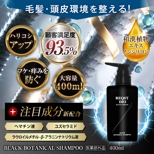 ヘアケア スカルプ シャンプー BLACK BOTANICAL SHAMPOO 普通肌 オイリー肌 ハリ コシ アップ ふけ かゆみ 予防 ボタニカル ノンシリコン 薬用 スカルプ 頭皮ケア メンズ レディース 薬用シャンプー 大容量400ml 送料無料 [医薬部外品] REQST DIO