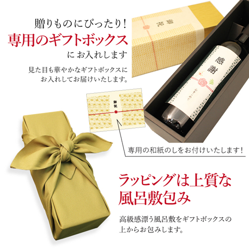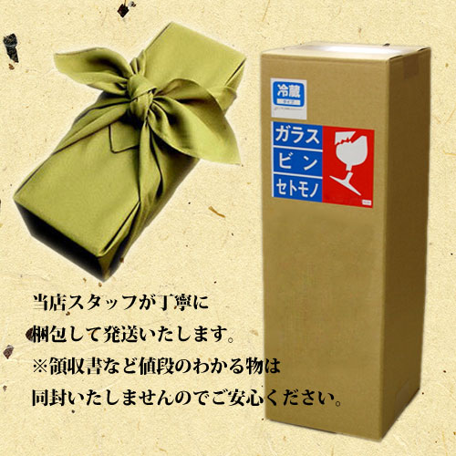 専用化粧箱に専用熨斗を巻き、その上から緑色の風呂敷で素敵に梱包します。