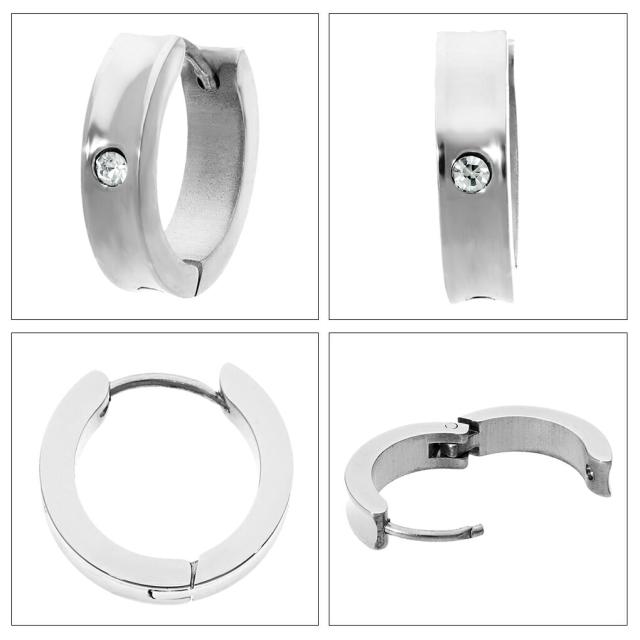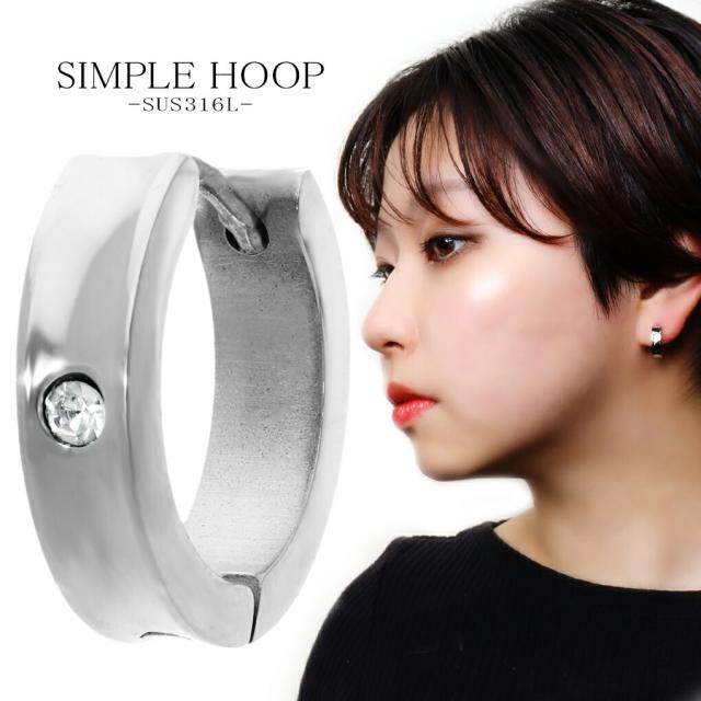 シルバーカラーに一粒のジルコニアを留めた、シンプルで高級感のあるステンレスフープピアス。