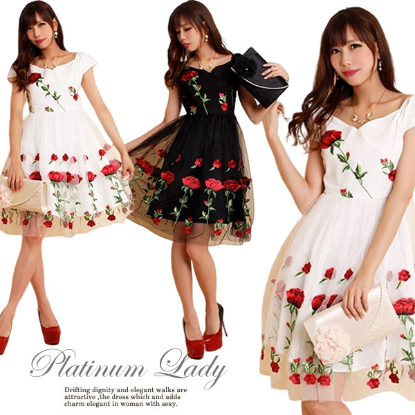 【S/M/Lサイズ】薔薇柄刺繍入りチュール重ねオフショルふわふわAラインパーティーミディドレス 「パーティ、アゲハ キャバ 2次会」