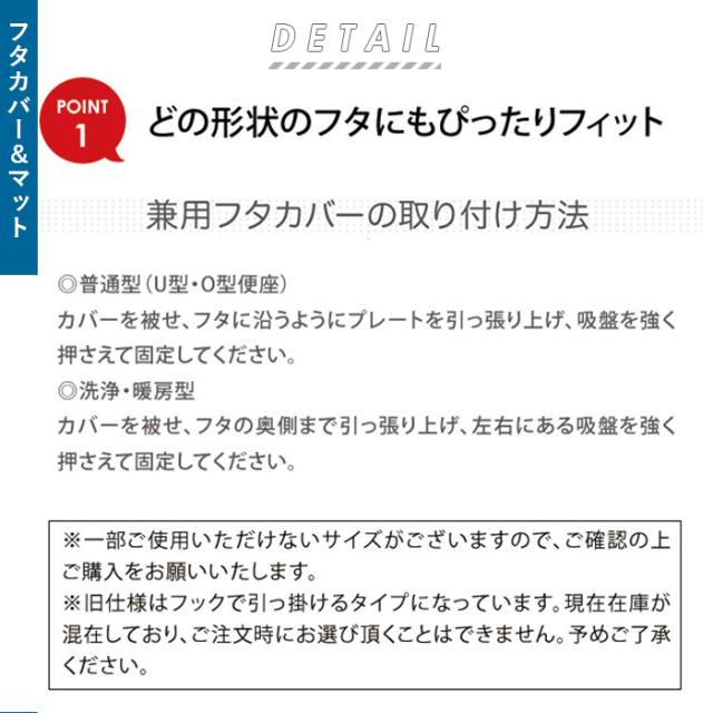 | サイズ | ・フタカバー [普通型]フタの縦の長さ+フタの手前の厚みが、約44cm以下に適応。 [洗浄・暖房型]フタの縦の長さ+フタの手前の厚みが約42cm〜約44cmに適応。 ・足元トイレマット:[縦]約55cm [横]約60cm ・スリッパ:[長さ]約27cm [幅]11.5cm(片足) ※サイズは当店平置き実寸サイズです。実際の商品とは多少の誤差が生じる場合がございます。あらかじめご了承ください。 |