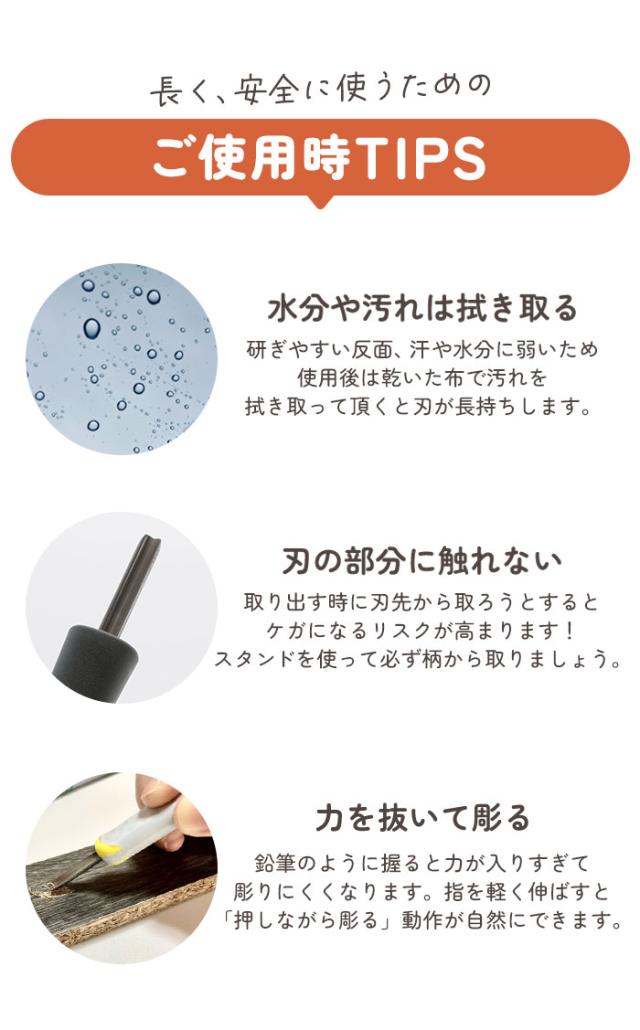 | サイズ | ・ケース [縦]約18.5cm [横]約9.5cm [厚み]約2cm ・彫刻刃(1本)[柄]約13.5cm [刃]約2.5cm ※サイズは当店平置き実寸サイズです。実際の商品とは多少の誤差が生じる場合がございます。あらかじめご了承ください。 |