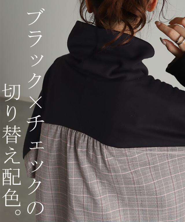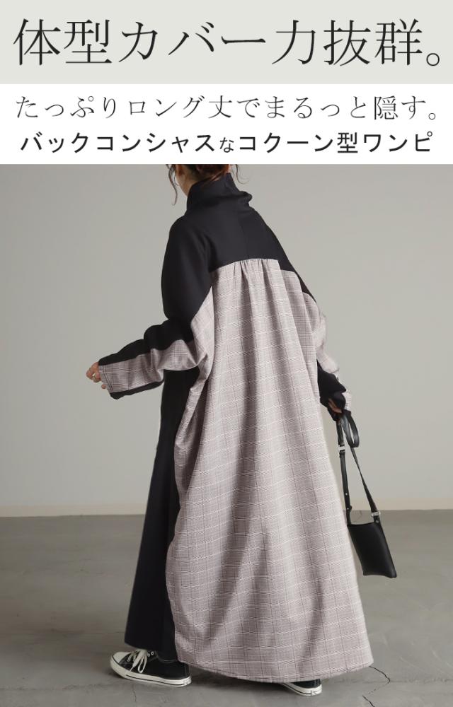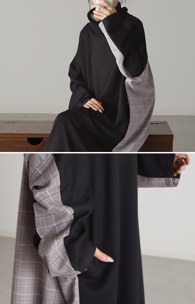 ブラック×グレンチェック切替のロングワンピース。