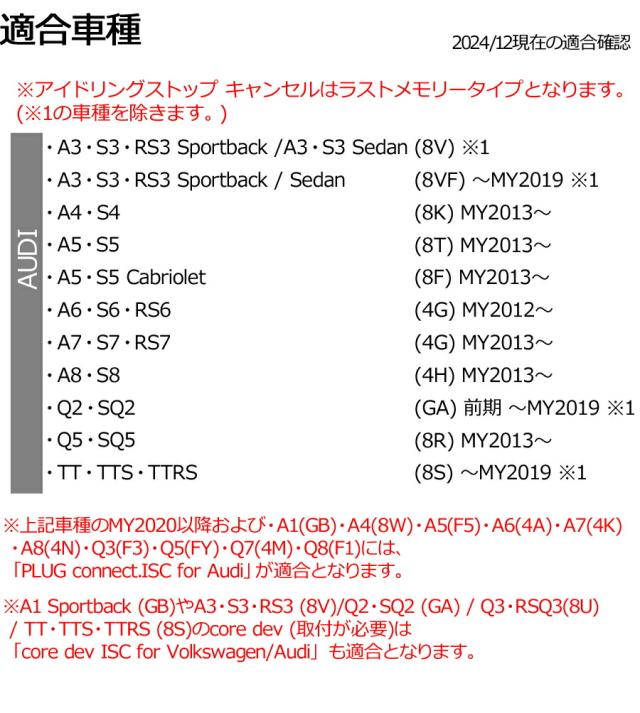 ![]() ![]() ![]() ![]() ![]() 使用することによって、アイドリングストップがキャンセルされた状態になります。車種によってエンジンを切る直前のアイドリングストップの状 態を記憶するラストメモリータイプもしくはアイドリングストップを強制的に off※1 にします。 技術的な作業は一切必要無く、車両の obd2 ポートに差し込むだけ。ランプがグリーン点滅からイエロー点灯になったら完了です。 元に戻したい場合は再度挿入するだけ。今度はグリーン点滅からブルー点灯になったら完了です。 本製品の内部に dip スイッチを内蔵し、リカバリーモードを搭載しております。万が一の際に対して本製品を挿す前の車両状態に戻す事が出来る機能です。 ![]() --------------------------------------- <適合> AUDI アウディ ※アイドリングストップ キャンセルはラストメモリータイプとなります。(※1の車種を除きます。) ・A3・S3・RS3 Sportback /A3・S3 Sedan (8V) ※1 ・A3・S3・RS3 Sportback / Sedan (8VF) 〜MY2019 ※1 ・A4・S4 (8K) MY2013〜 ・A5・S5 (8T) MY2013〜 ・A5・S5 Cabriolet (8F) MY2013〜 ・A6・S6・RS6 (4G) MY2012〜 ・A7・S7・RS7 (4G) MY2013〜 ・A8・S8 (4H) MY2013〜 ・Q2・SQ2 (GA) 前期 〜MY2019 ※1 ・Q5・SQ5 (8R) MY2013〜 ・TT・TTS・TTRS (8S) 〜MY2019 ※1 ※上記車種のMY2020以降および・A1(GB)・A4(8W)・A5(F5)・A6(4A)・A7(4K)・A8(4N)・Q3(F3)・Q5(FY)・Q7(4M)・Q8(F1)には、PLUG connect.ISC for Audiが適合となります。 ※A1 Sportback (GB)やA3・S3・RS3 (8V)/Q2・SQ2 (GA) / Q3・RSQ3(8U) / TT・TTS・TTRS (8S)のcore dev (取付が必要)はcore dev ISC for Volkswagen/Audi も適合となります。 --------------------------------------- ※ご注意: ev・プラグインハイブリット・ハイブリット除くアイドリングストップ機能装着車に適合します ※リカバリーモードについて: 本製品をインストールする前の車両状態に戻す事が出来る機能です。 ※1 アイドリングストップ キャンセルは強制offタイプとなります。 (my2020以降は適合外となります。適合する商品はPLUG connect.ISC for Audiをご確認ください。) ●あらたに追加された車種やソフトウェアのアップデート等がありますので、購入される前に販売店へ適合をご確認下さい。 ●本製品は車両の車体番号にて管理しています。別の車両には使用出来ません。 ●本製品を購入後1年以内に車両ソフトウェアがバージョンアップした場合、対応出来次第無償にて製品のソフトウエアをアップデートさせていただきます。尚、ソフトウェアのアップデートサービスが終了した製品につきましては購入後1年以内でも保障対象外とさせていただきます。 ※本製品の適合している車両でも、予告なく変更された車両仕様により本製品をインストールができない場合があります。それに伴う発生した工賃・部品などの費用はお客様のご負担となります。 ●本製品はコーディング変更や他社の製品による同等の変更に対して使用すると、正常にインストール出来ない場合がありますので併用しないでください。保証対象外となります。 ●製品はご購入日より1年保証となります。 ![]()