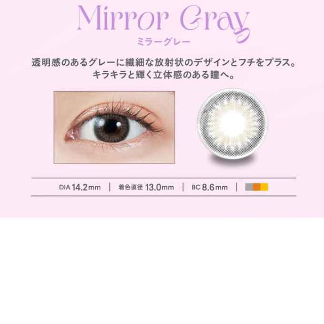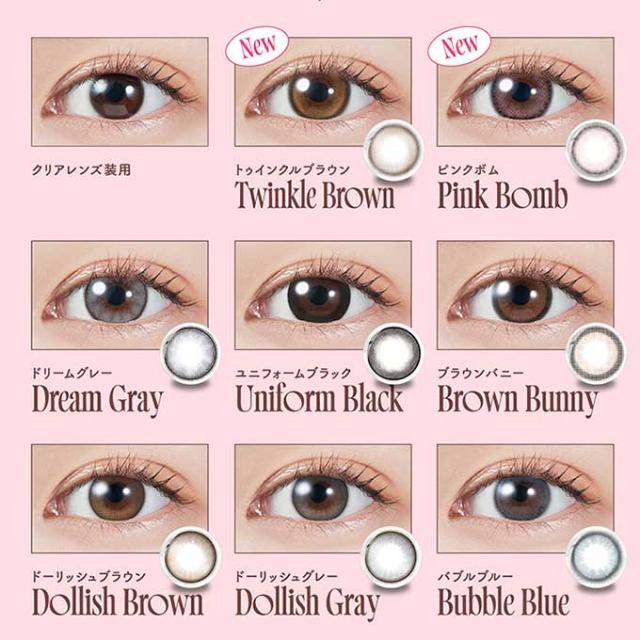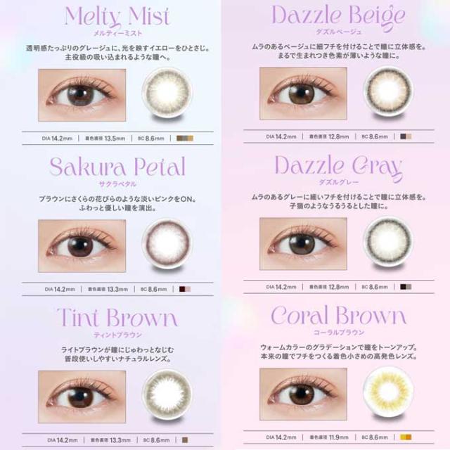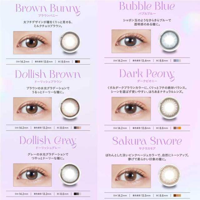 | ◆スペック◆ | 直径(DIA):14.2/14.5mm ベースカーブ(BC):8.6mm 着色直径: 【13.8mm】ドリームグレー,ユニフォームブラック,トゥインクルブラウン,ピンクボム 【13.6mm】ダークピオニー,ブラウンバニー 【13.5mm】サクラスモア,メルティーミスト, 【13.4mm】バブルブルー 【13.3mm】Sakura Petal、Tint Brown 【13.2mm】ドーリッシュブラウン,ドーリッシュグレー 【13.0mm】Mirror Gray 【12.8mm】Dazzle Beige、Dazzle Gray 【11.9mm】Coral Brown |