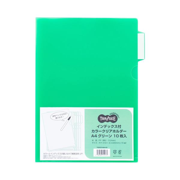 (まとめ) TANOSEEインデックス付カラークリアホルダー A4 グリーン 1セット(30枚:10枚×3パック) 〔×10セット〕 【北海道・沖縄・離島配送不可】
