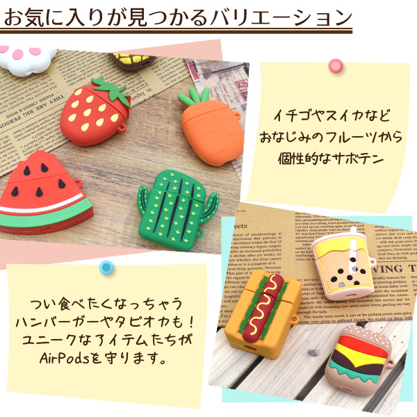 おもしろ やわらかシリコン AirPodsケース 充電用穴付き 収納したまま充電可能 airpods イヤホンケース ケースカバー ユニーク 人参 苺 pineapple ねこ すいか サボテン エビ ホットドッグ ぱんだ ボール hamburger ソフトクリーム タピオカ tapioca 送料無料