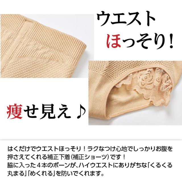 はくだけでウエストほっそり!ラクなつけ心地でしっかりお腹を押さえてくれる補正下着(補正ショーツ)です!脇に入った4本のボーンが、ハイウエストにありがちな「くるくる丸まる」「めくれる」を防いでくれます。
