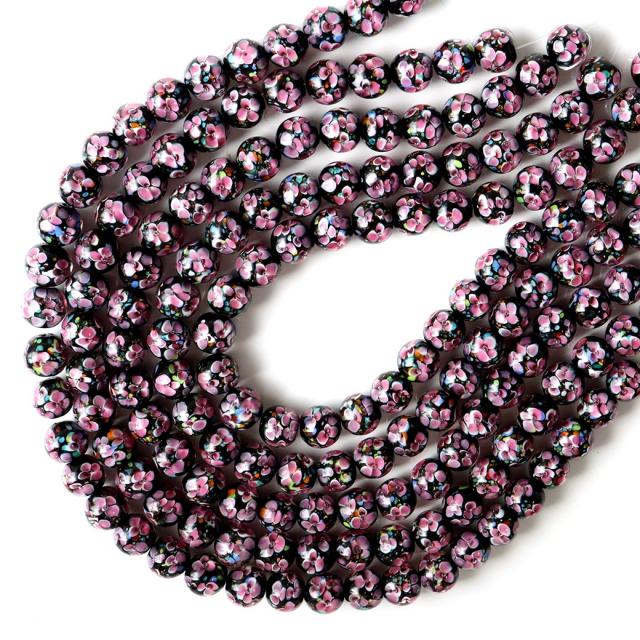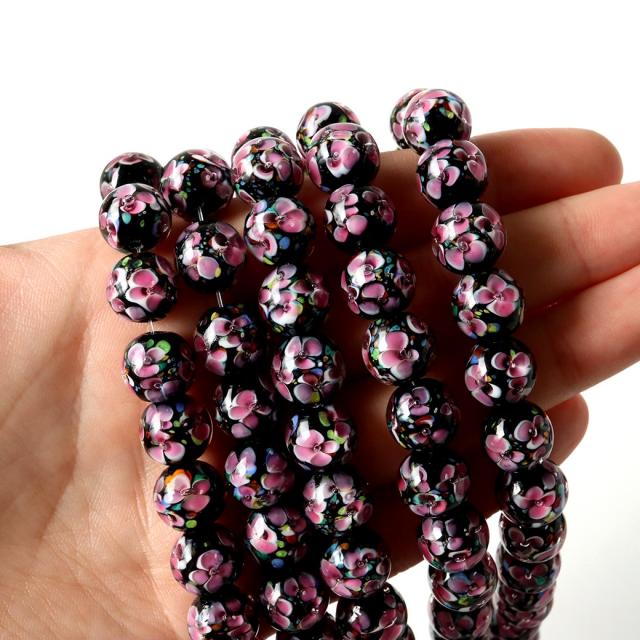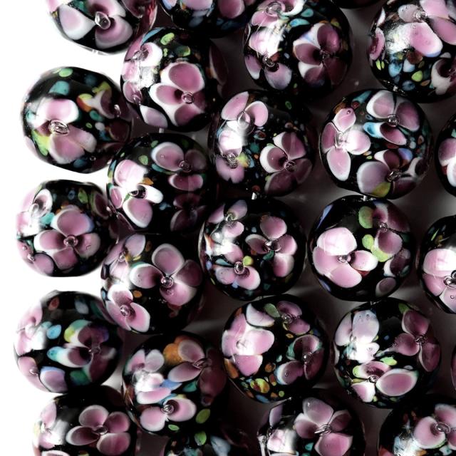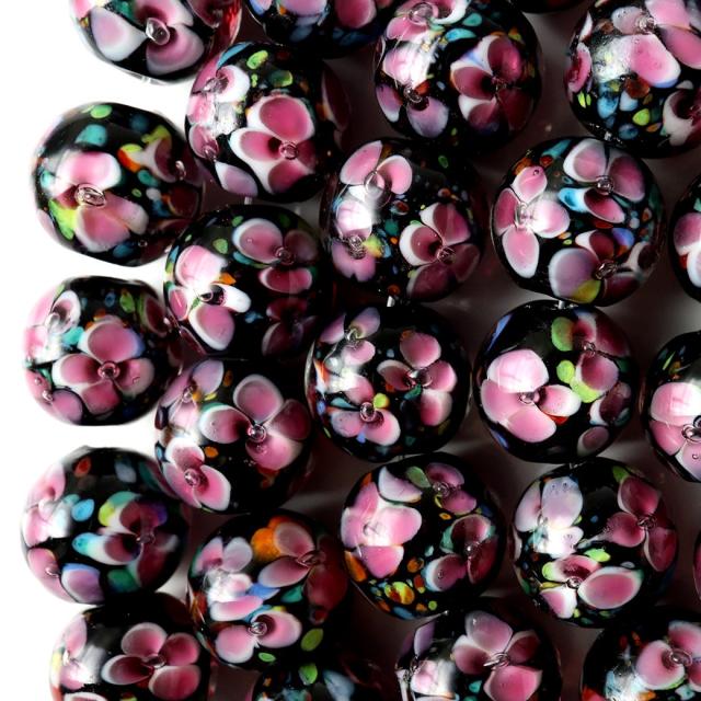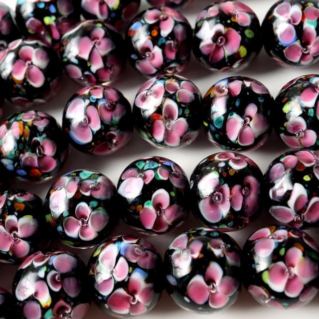 透明なガラス内に、様々な色合いのガラスで花などの絵柄や模様を封じ込めた人工ビーズです。
