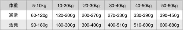 ・犬によって必要とする食事量は違います。与え始めはこの表を参考にして、そのあと必要に応じて量を調節してください。