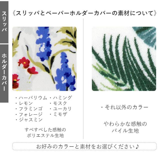 | 素材 | 【フタカバー・足元トイレマット】アクリル100% 【スリッパ】アクリル100%またはポリエステル92%、ポリウレタン8% (生産時期によって素材が異なっております、予めご了承下さい) 【ペーパーホルダーカバー】 [ハーバリウム・レモン・フラミンゴ・ジャスミン] 表生地:ポリエステル100% [フォレージ]表生地:ポリエステル92%、ポリウレタン8% [アイビー] 表生地:アクリル100% [モンステラ・バード・ボタニカ・ラネージュ・グロリア・タイムズスクエア] (表生地)パイル糸:アクリル100% 地糸:ポリエステル100% [ポピー・ユーカリ・ミモザ] 表生地:ポリエステル92%、ポリウレタン8% |