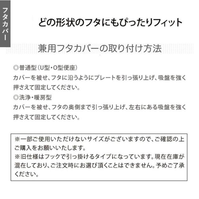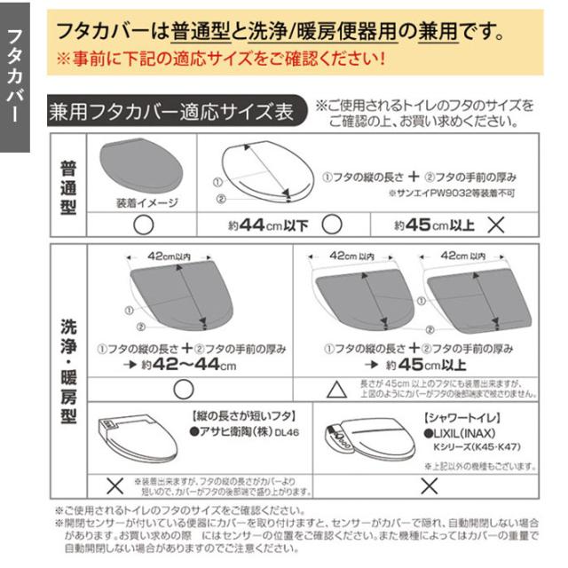 | サイズ | ・フタカバー [普通型]フタの縦の長さ+フタの手前の厚みが、約44cm以下に適応。 [洗浄・暖房型]フタの横の長さが42cm以内 フタの縦の長さ+フタの手前の厚みが約42cm〜約44cmに適応。 ・足元トイレマット:[縦]約55cm [横]約60cm ・ペーパーホルダーカバー:[全長]約40cm [幅]約16.5cm [ホルダーカバー部分]長さ:約17cm [予備ペーパーストック部分]長さ:約24cm [ペーパーストック部分]内寸:約43cm ・スリッパ:[長さ]約27cm [幅]11.5cm(片足) ※サイズは当店平置き実寸サイズです。実際の商品とは多少の誤差が生じる場合がございます。あらかじめご了承ください。 |