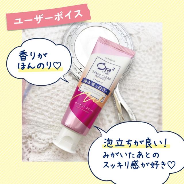 歯のくすみ・黄ばみなどのステイン(着色汚れ)を落として、つきにくくすることで、歯本来の白さを取り戻し、キレイな歯を保ちます。しっかりステインを落とす「トリプルクレンズ処方」タイプです。高濃度フッ素配合で虫歯も防ぎます。華やかなピーチがほのかに香るフレーバー。しっかりステインケアをしたい方におすすめです。