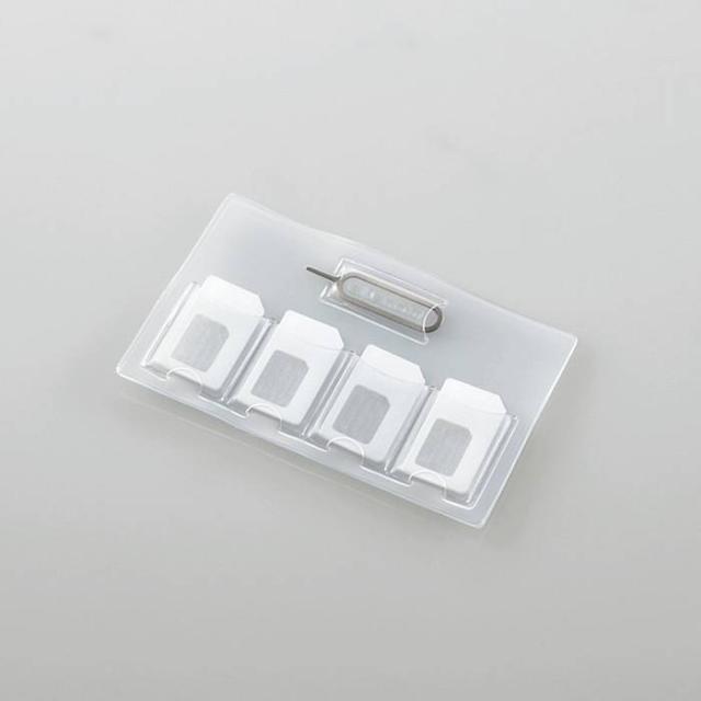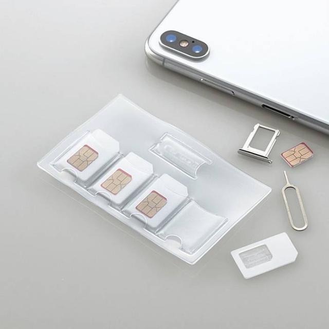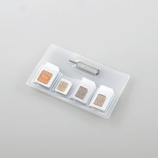 SIMカード/miniSIMカード/nanoSIMカードを合計4枚収納できるSIMカードケースです。使用していないSIMカードをまとめて収納・管理するのに便利です。カードサイズで財布のポケットにも収納可能です。小さなnanoSIMカードも、専用のnanoSIM収納アダプターを使用することできっちり収納できます。SIMカードの入れ替えに使用するSIMトレイ開閉ピンが付属しています。柔軟性のあるPVC素材を使用し、カードの取り出しも簡単にできます。クリアカラーを採用しているので、ケースの外側から収納状況を確認可能です。