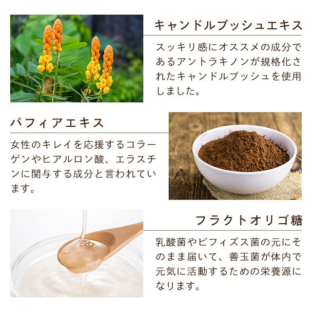 発酵紅茶エキス末(デキストリン、発酵紅茶エキス)(国内製造)、食用ぶどう油、ひまわり油、植物発酵エキス末(デキストリン、植物発酵エキス)(大豆・リンゴ・カシューナッツ・オレンジ・バナナ・キウイフルーツ・ゴマ・モモ・やまいもを含む)、キャンドルブッシュエキス末(キャンドルブッシュエキス、デキストリン)、パフィアエキス末(パフィア抽出物、デキストリン)、乳酸菌末(乳酸菌(殺菌)、デキストリン)(乳成分を含む)、フラクトオリゴ糖/ゼラチン、グリセリン、ミツロウ、グリセリン脂肪酸エステル、植物レシチン(大豆由来)