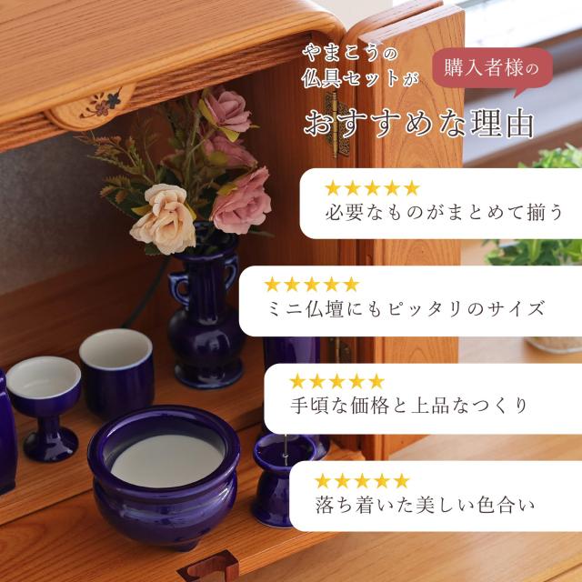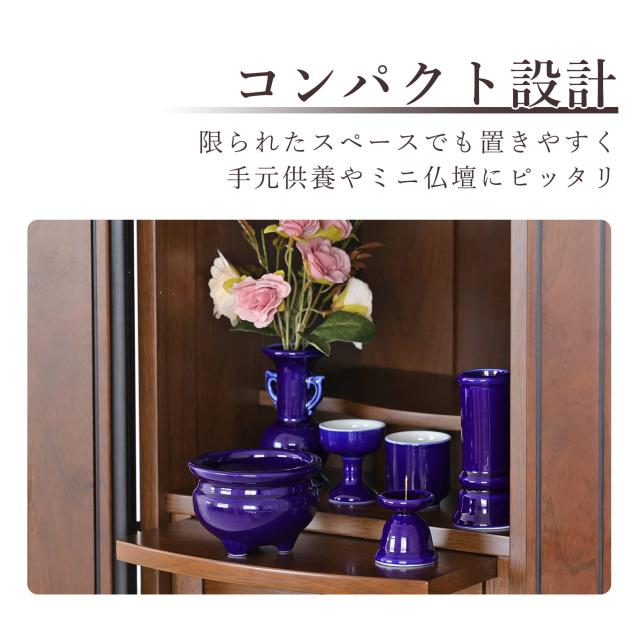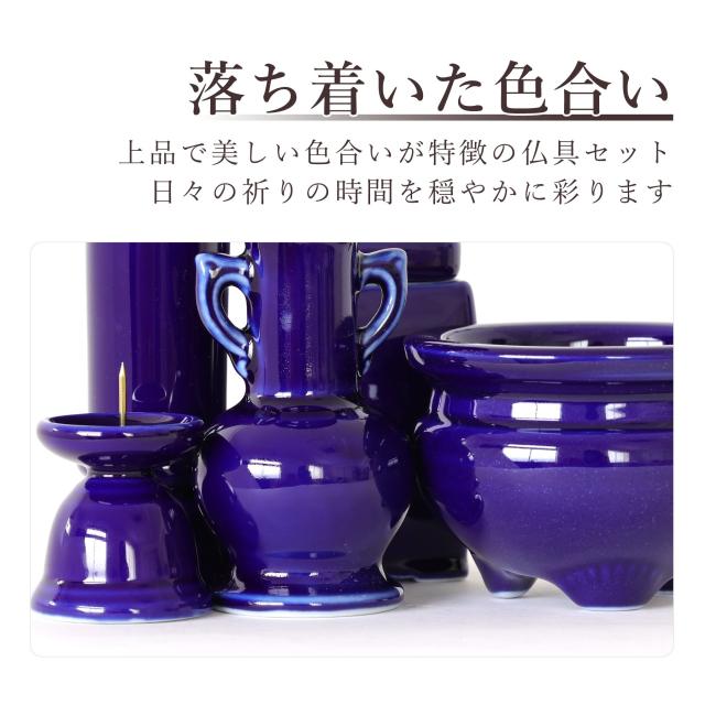 落ち着いた深みのある美しいブルーが印象的な、国産陶器の仏具セット。