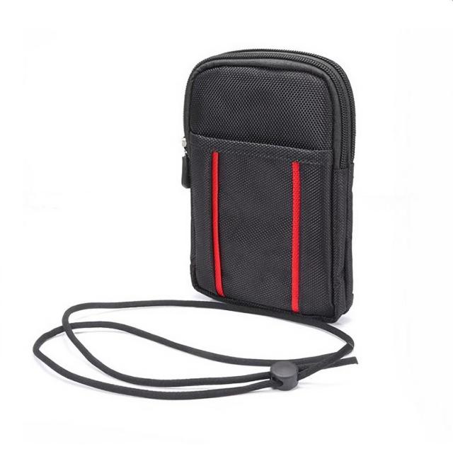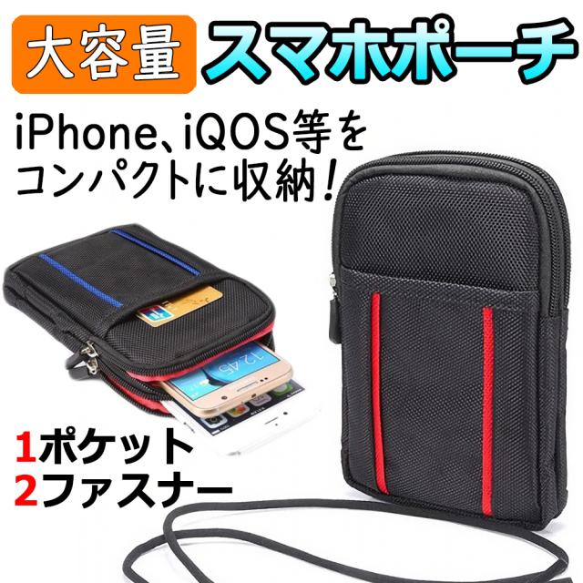 スマホ用 ベルト掛け ウエストポーチ [ブラック&レッド] 貴重品の収納 便利 2ファスナー カラビナ ポーチ ナイロン 電子タバコ 送料無料 スマートフォン 小物 ケース ダブル ファスナー 開閉 バッグ カバン かばん ベルト ズボン 引っ掛ける iPhone Android 小型 旅行 薬入れ