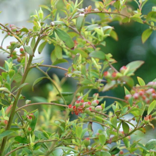 ブルーベリーよりも花も果実も小さく葉も小さいです。完熟果にいたっては皮だけでなく、果肉も青紫色です。