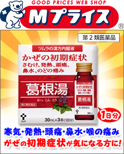 ◆特 長◆ 「かぜ内服液 葛根湯S 30ml×3」は、風邪のひきはじめの諸症状の緩和を目的として開発された、服用しやすい液体の風邪薬です。さむけ、発熱、頭痛、鼻水、のどの痛みなどの風邪の初期症状に効果的です。医薬品。 ◆メーカー(※製造国又は原産国:日本)◆ 株式会社ツムラ 〒107-8521 東京都港区赤坂二丁目17番11号 お客様相談窓口 : 0120-329-930(フリーダイヤル) 受付時間 : 9時から17時30分(休業日を除く) ◆効果・効能◆ かぜの初期症状(発熱、さむけ、頭痛、鼻水、鼻づまり、のどの痛み、肩・首筋のこわばり) ◆用法・用量◆ 次の量を、食間に服用してください。 年 齢:1 回 量:1日服用回数 成人(15歳以上):1本:3回 15歳未満:服用しないでください 本剤は本質的に沈澱を含みますので、服用前によく振ってから服用してください ◆成 分◆ 本品1日量90ml(30ml*3本)中以下の生薬より抽出した葛根湯エキス83gを含有します。 日局カッコン-8.0g、日局マオウ-4.0g、日局タイソウ-4.0g、日局ケイヒ-3.0g、日局シャクヤク-3.0g、日局カンゾウ-2.0g、日局ショウキョウ-1.0g 添加物として転化型液糖(白糖果糖ブドウ糖)、日局ハチミツ、日局安息香酸ナトリウム、日局パラオキシ安息香酸ブチル、エタノール、ポリオキシエチレン硬化ヒマシ油、日局クエン酸、日局炭酸水素ナトリウム、香料、エチルバニリン、グリセリン、バニリン、プロピレングリコールを含有します。 ◆保管上の注意◆ (1)直射日光の当たらない湿気の少ない涼しい所に密栓して保管してください。 (2)小児の手の届かない所に保管してください。 (3)他の容器に入れ替えないでください。誤用の原因になったり、品質が変わるおそれがあります。 (4)使用期限をすぎた製品は、使用しないでください。 (5)容器の開封日記入欄に、開封した日付を記入してください。 ※その他、医薬品は使用上の注意をよく読んだ上で、それに従い適切に使用して下さい。 ※ページ内で特に記載が無い場合、使用期限1年以上の商品をお届けしております。 |