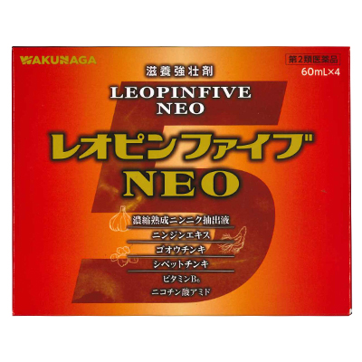 レオピンファイブネオは、ニンニクを長期間かけ抽出・熟成し、濃縮して得られた濃縮熟成ニンニク抽出液に、ニンジンエキス、ゴオウチンキ、シベットチンキ、ビタミンB6及びニコチン酸アミドを配合した滋養強壮剤です。