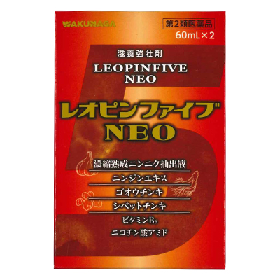 レオピンファイブネオは、ニンニクを長期間かけ抽出・熟成し、濃縮して得られた濃縮熟成ニンニク抽出液に、ニンジンエキス、ゴオウチンキ、シベットチンキ、ビタミンB6及びニコチン酸アミドを配合した滋養強壮剤です。