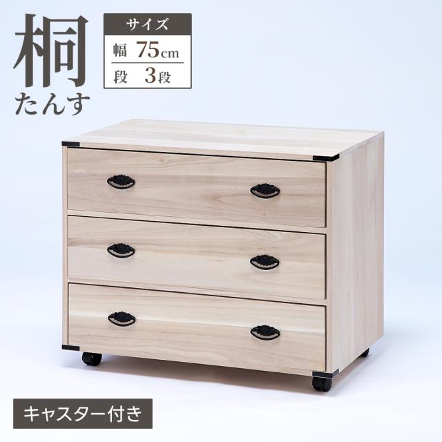 桐たんす キャスター付き 幅75cmタイプ 3段 衣類収納 押入れ収納 収納庫 桐製 タンス 箪笥 車輪 移動 防虫 翌日配送