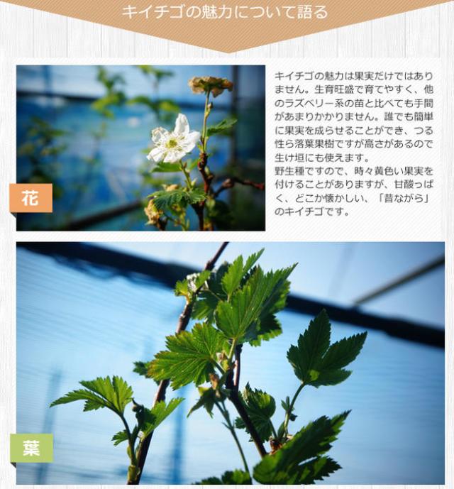 キイチゴの魅力は果実だけではありません。生育旺盛で育てやすく、他のラズベリー系の苗と比べても手間があまりかかりません。誰でも簡単に果実を成らせることができます。野生種ですので時々黄色い果実を付けることがありますが、甘酸っぱくどこか懐かしい『昔ながら』のキイチゴです。
