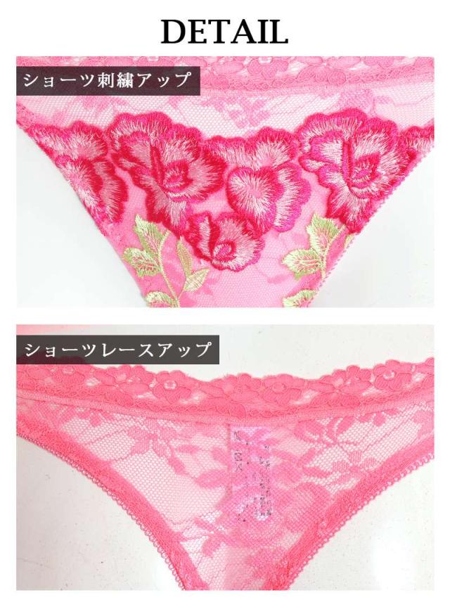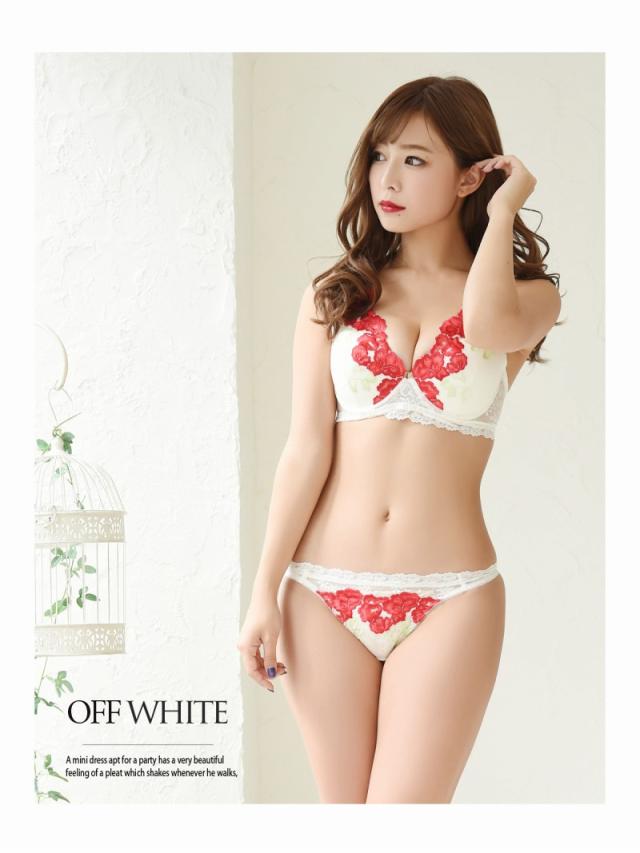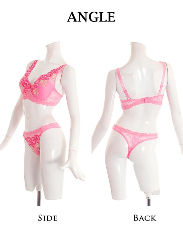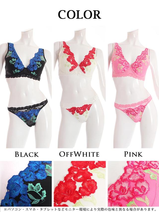 ☆大ぶりの花柄刺繍がカップの上辺からストラップまであしらわれた、華やかな印象のブラ&Tバック2点セット♪