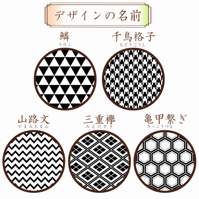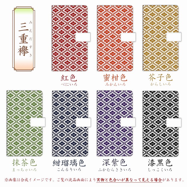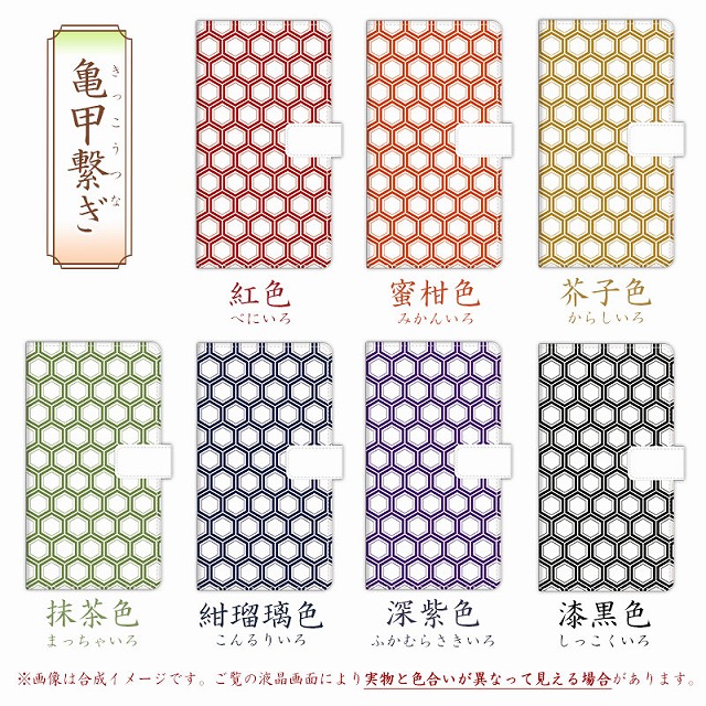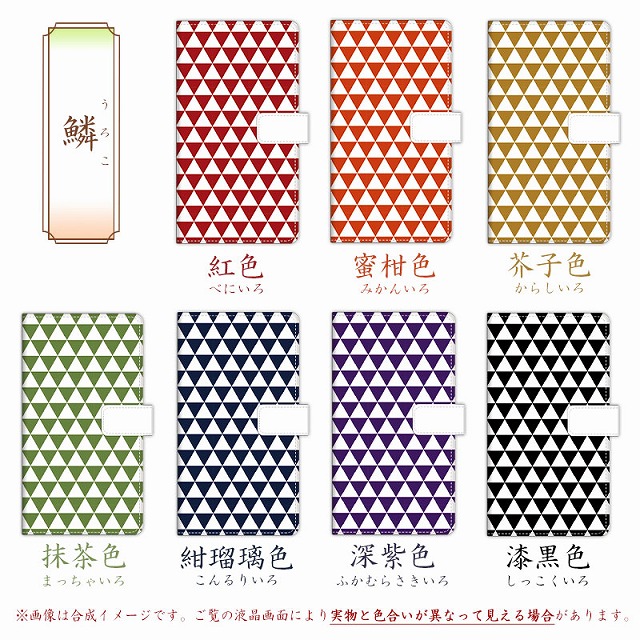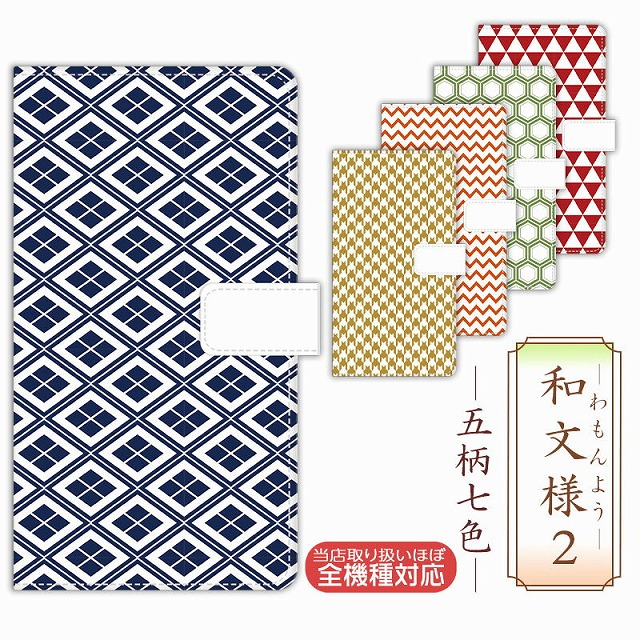 鱗、千鳥格子、山路文、三重襷、亀甲繋ぎの5デザインによる和風の手帳型スマホケース。