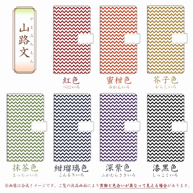 紅色(べにいろ)、蜜柑色(みかんいろ)、芥子色(からしいろ)、抹茶色(まっちゃいろ)、紺瑠璃色(こんるりいろ)、深紫色(ふかむらさきいろ)、漆黒色(しっこくいろ)の七色からお選びください。