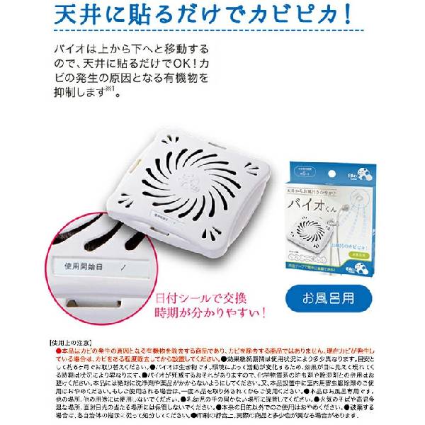 防カビ バイオ君(お風呂用)バイオの力でお手軽にカビ防止と消臭!お風呂の天井に貼るだけで、バイオの力でカビや悪臭を防ぐカビ取りです。約500億匹の目に見えない小さな微生物が、カビや悪臭、汚れを食べて、それを体内で消化分解し、無機物に変えます。人畜無害で、酸、アルカリのような薬品も含まれていないので、施設、及び器具などにも安心です。【商品詳細】
