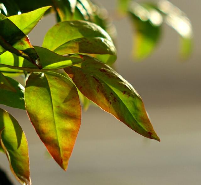 葉先に黄葉の名残があるオタフクナンテン
