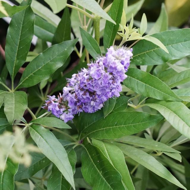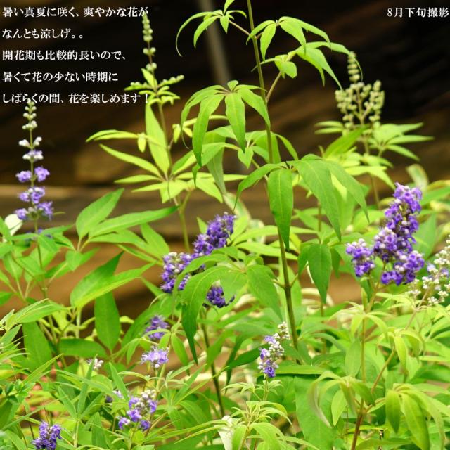 ハーブの一種で、【チェストベリー】とも呼ばれています。樹勢強く、寒さや暑さにも強いので育てやすくておすすめです。花には芳香があり、葉にも香りがあり、開花期が比較的長いので、ず〜っと花を楽しめます。風でこすれるとイイ香りを漂わせてくれます。葉は5〜9枚の手のひら状になり、花のない時期でも楽しむことができます。