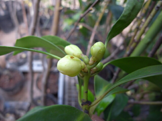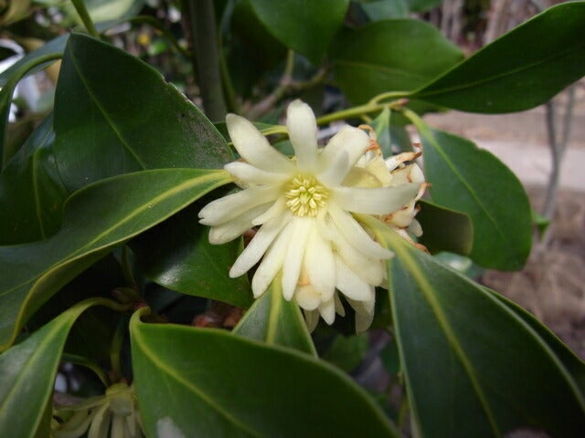3月〜4月にかけて花径3cmくらいのクリーム色の花を咲かせます。葉は深い緑色で光沢があり美しいです。