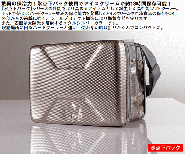 氷点下パックシリーズの性能をより高めるアイテムとして誕生した高性能ソフトクーラー。セットで使えばハードクーラー並みの保冷能力を発揮してアイスクリームや冷凍食品の保存もOK。外部からの衝撃に強くシェルプロテクト構造により瓶類等を守ります。また表面は太陽光を反射するメタルシルバーカラーです。収納場所に困るハードクーラーと違い使わない時は折りたたんでコンパクトに。保冷剤は別売りの「氷点下パック-16℃」がおすすめです。■総重量約900g■サイズ約幅30×奥行24×高さ24cm■内寸約幅26×奥行21×深さ22cm■容量約12L■収納サイズ約縦24.5×横30.5×高さ11cm■主素材:EVA、PP、PE、PVC、ナイロン※容量表記は目安です。本品は氷点下パックに適切なクーラーボックスとして開発していますがクーラー内温度が氷点下になるわけではありません。アイスクリームの保冷には氷点下パックが必要です。アイスクリームの保存時間はメーカー実験データによるものです。食材は必ず容器に入れた状態でクーラーバッグ内に入れて下さい。