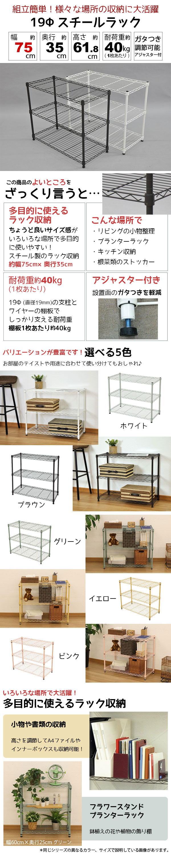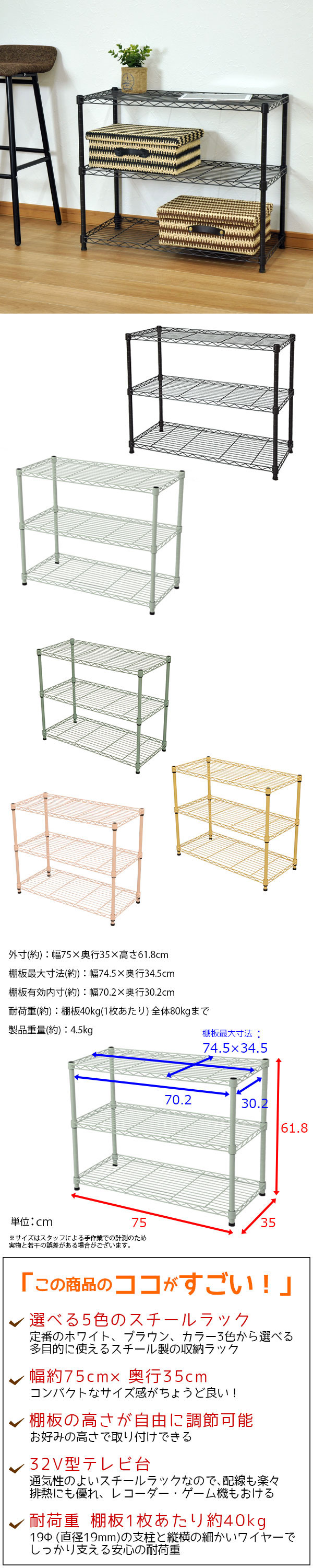 スチールラック3段 幅75cm 奥行35cm 高さ61.8cm (奥行35cm)リビング収納 おもちゃ収納 玄関収納 押し入れ収納 すきま収納 多目的ラック フリーラック シンプル おしゃれ かわいい ホワイト ブラウン 可動棚板 移動棚板 アジャスター付き 簡単組立(NS-7535)
