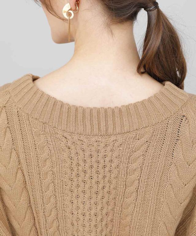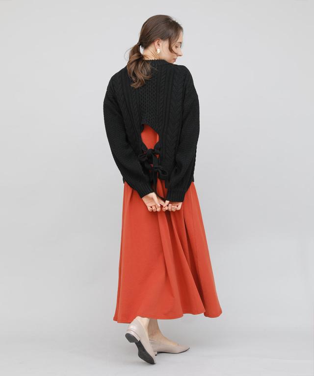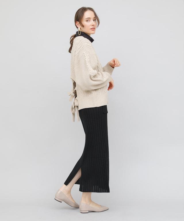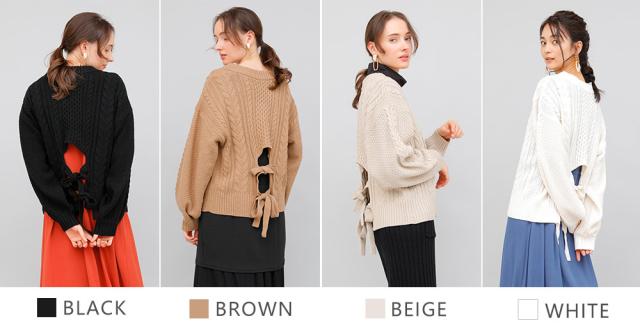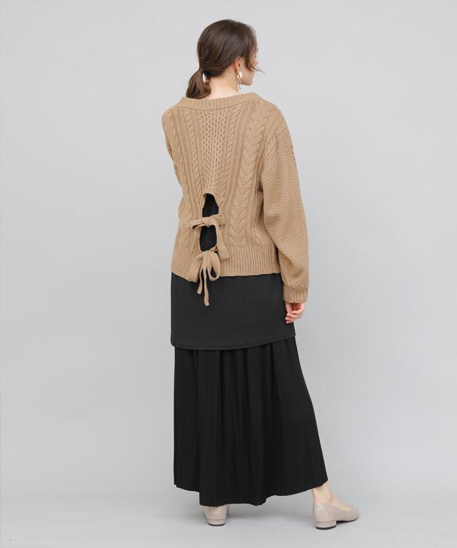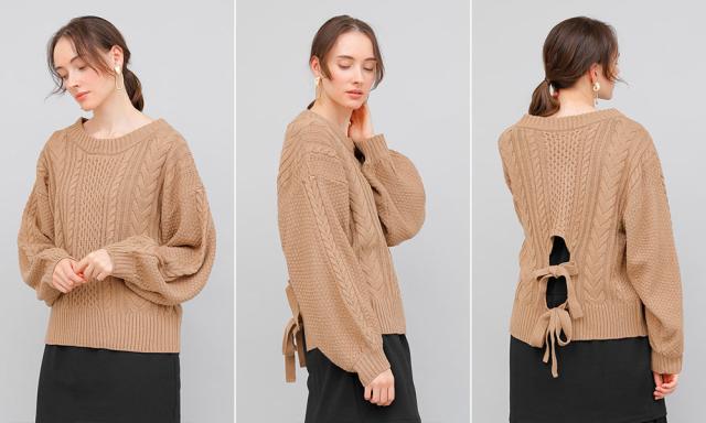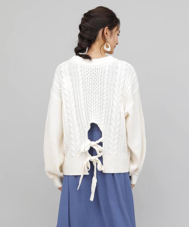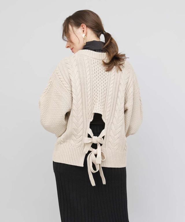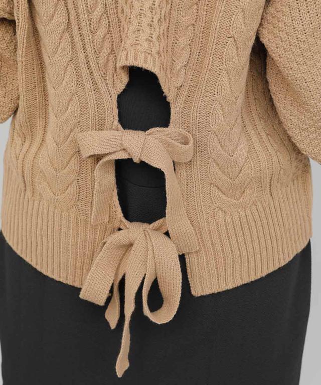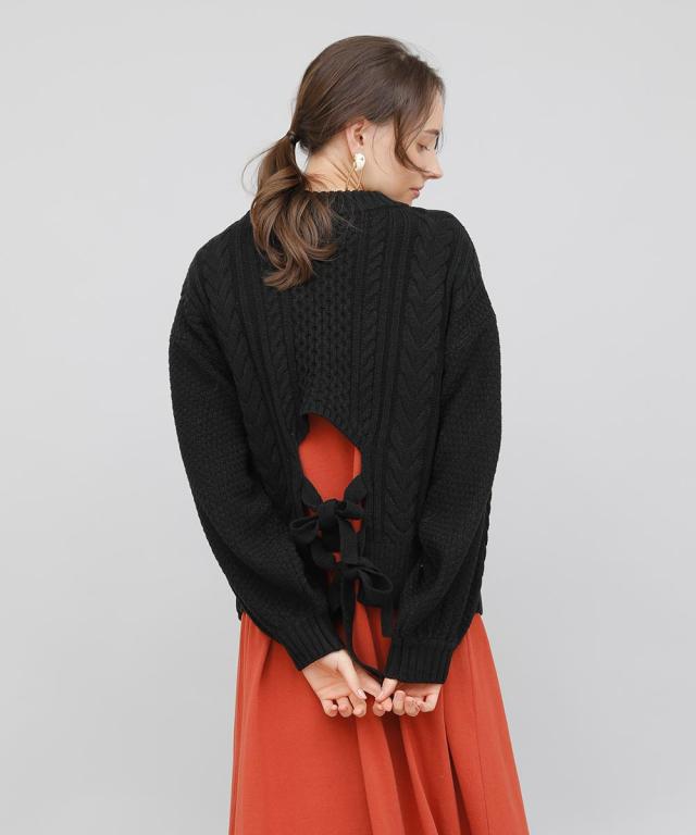 バックデザインケーブルニット ケーブルニット レディース セーター ニット 長袖 秋冬 リボン スリット ケーブル 【BELL】