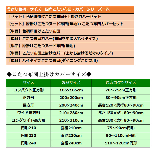 ◆こたつ布団上掛けカバーサイズ一覧◆