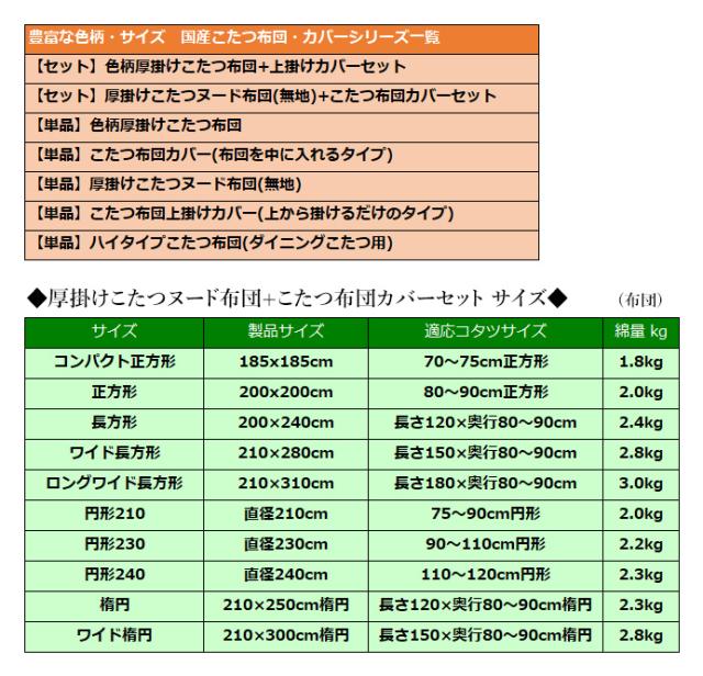 ◆厚掛けこたつヌード布団(無地)+こたつ布団カバーセット サイズ一覧◆