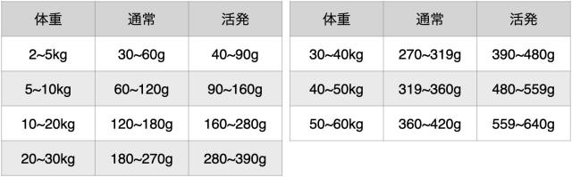 ・犬によって必要とする食事量は違います。与え始めはこの表を参考にして、そのあと必要に応じて量を調節して下さい。